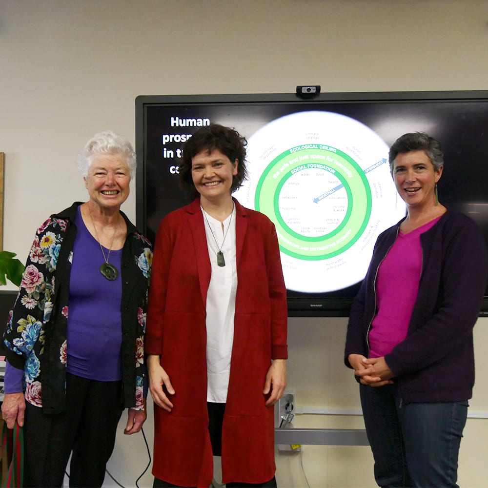 Photo: Jeanette visiting Oxfam New Zealand 2019 – Jeanette Fitzsimons left, Kate Raworth centre, Jo Spratt Oxfam’s Advocacy and Campaigns Director right. Oxfam New Zealand