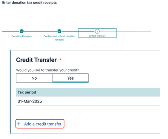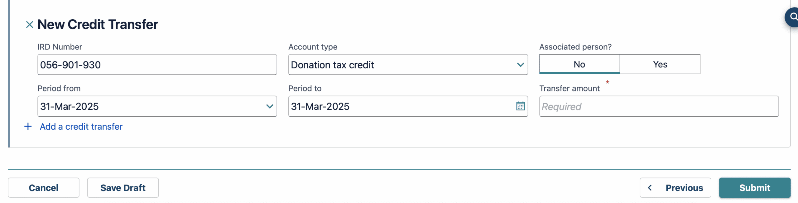 Click the ‘+ Add a credit transfer’ button and then fill in the following fields: