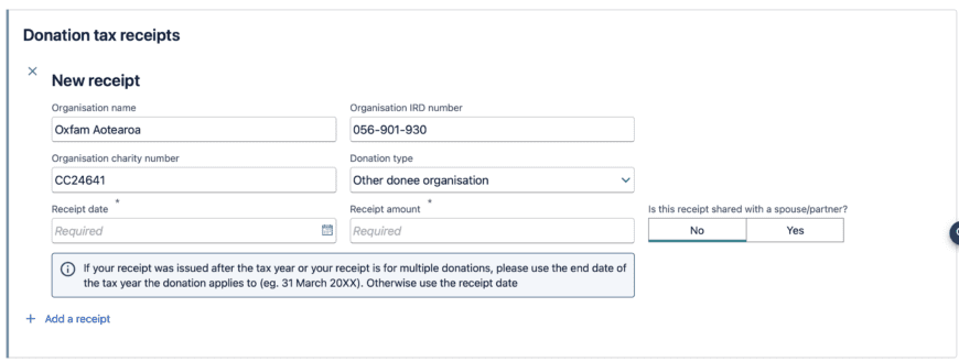 Click ‘Yes‘ if you wish to donate some or all of your tax credit back Oxfam Aotearoa and if so, thank you so much, you’re amazing!