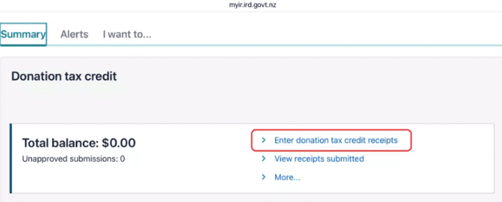 If ‘Donation tax credit’ is not an option on your home page, you can add it by going to ‘I want to…’ section then ‘Register for donation tax credit’, and fill in the registration form then submit it to the IRD.