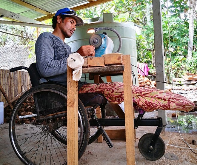 Seven years ago, Sione Te’i fell from a multi-storied building and completely paralysed both of his legs. He’s confined to a wheelchair 24/7, with his legs covered, which seriously limits income-generating opportunities for him.